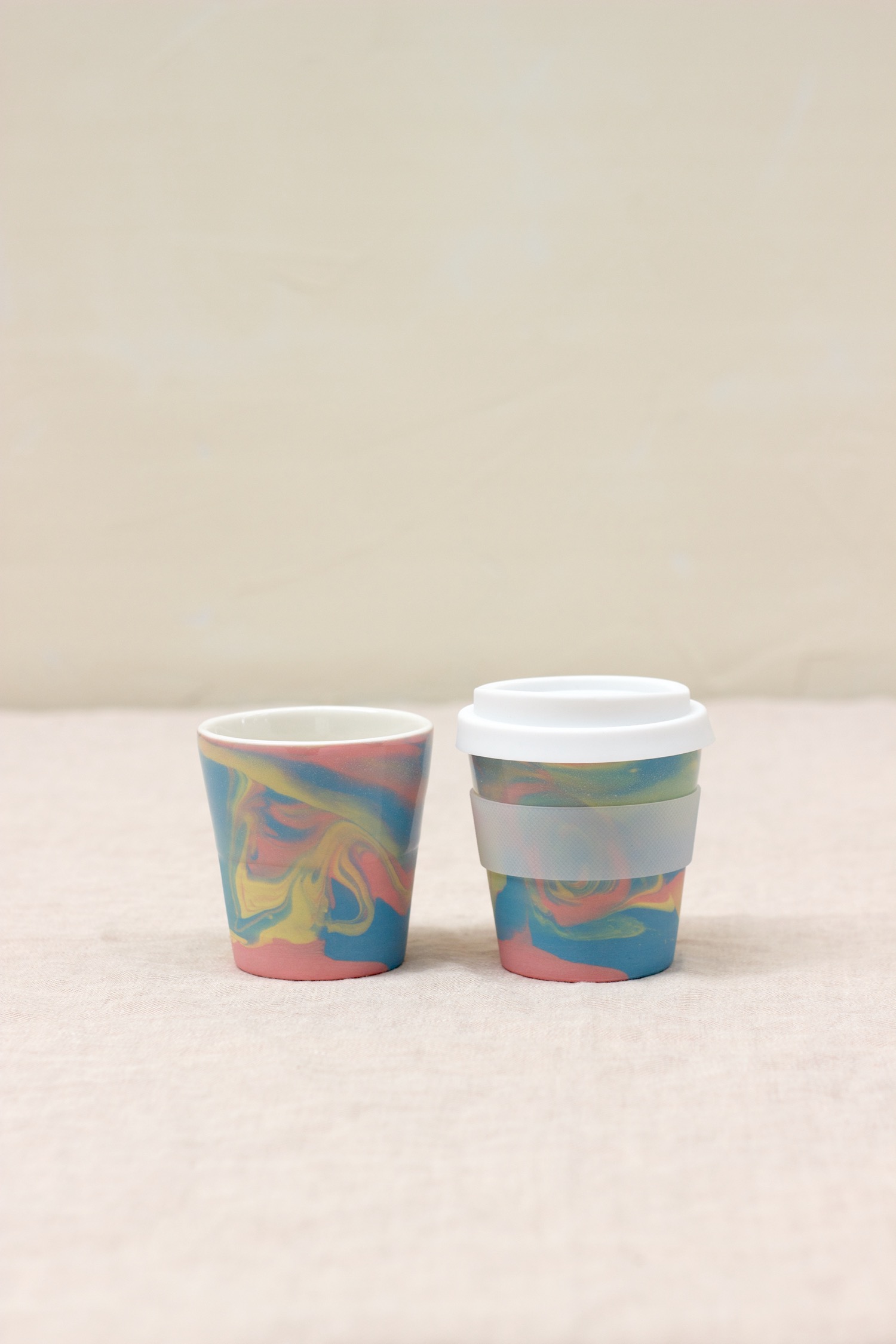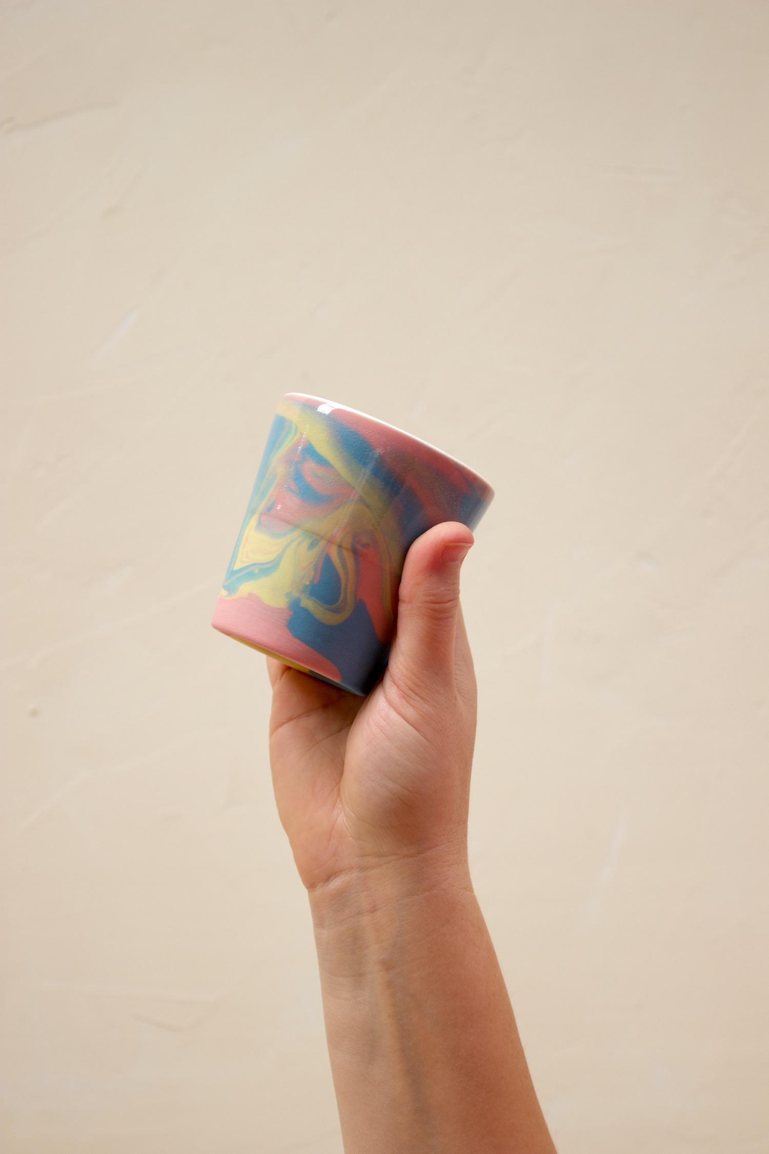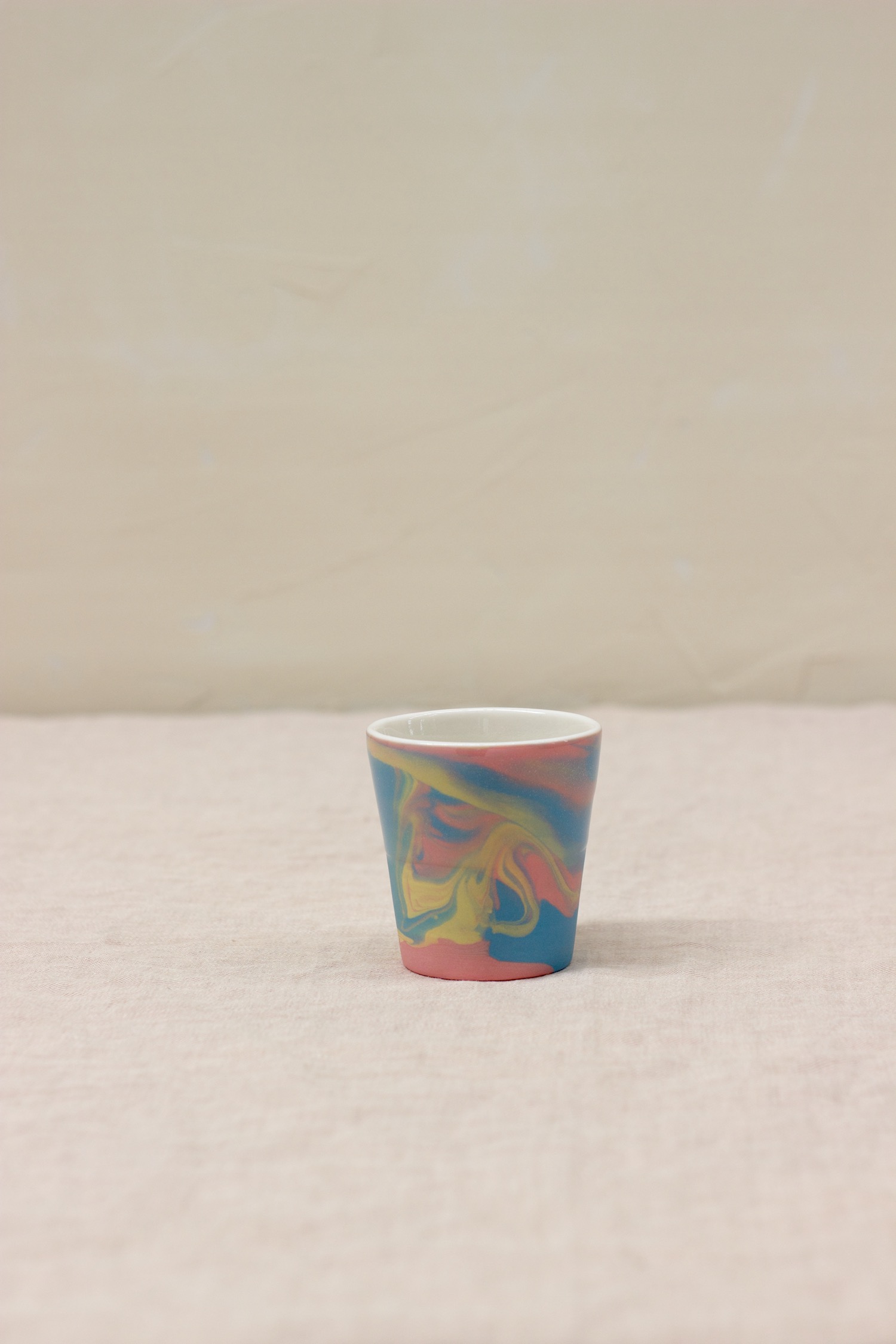 These cups are made with coloured slips which are individually marbled on the exterior, then lined with a plain white on the interior. All pieces are coated with a layer of clear glaze on the inside of the piece, and halfway down the outside, so when you hold the cup you can feel the difference between the glazed and unglazed surface of the porcelain. Each piece is totally unique, and no two patterns are the same!