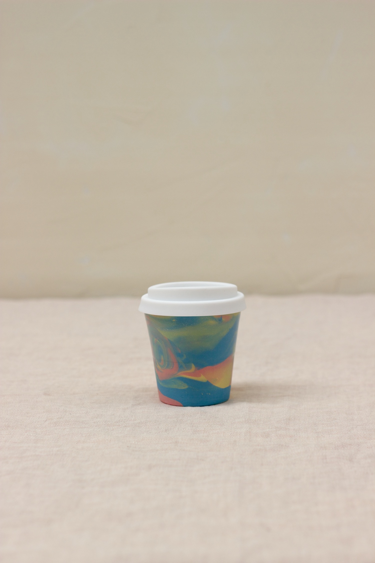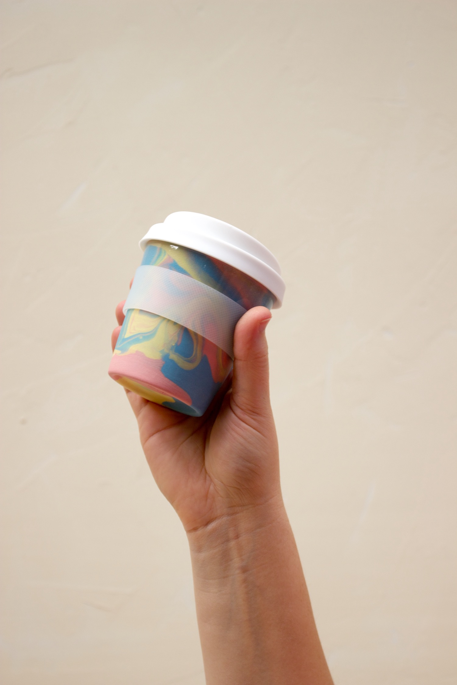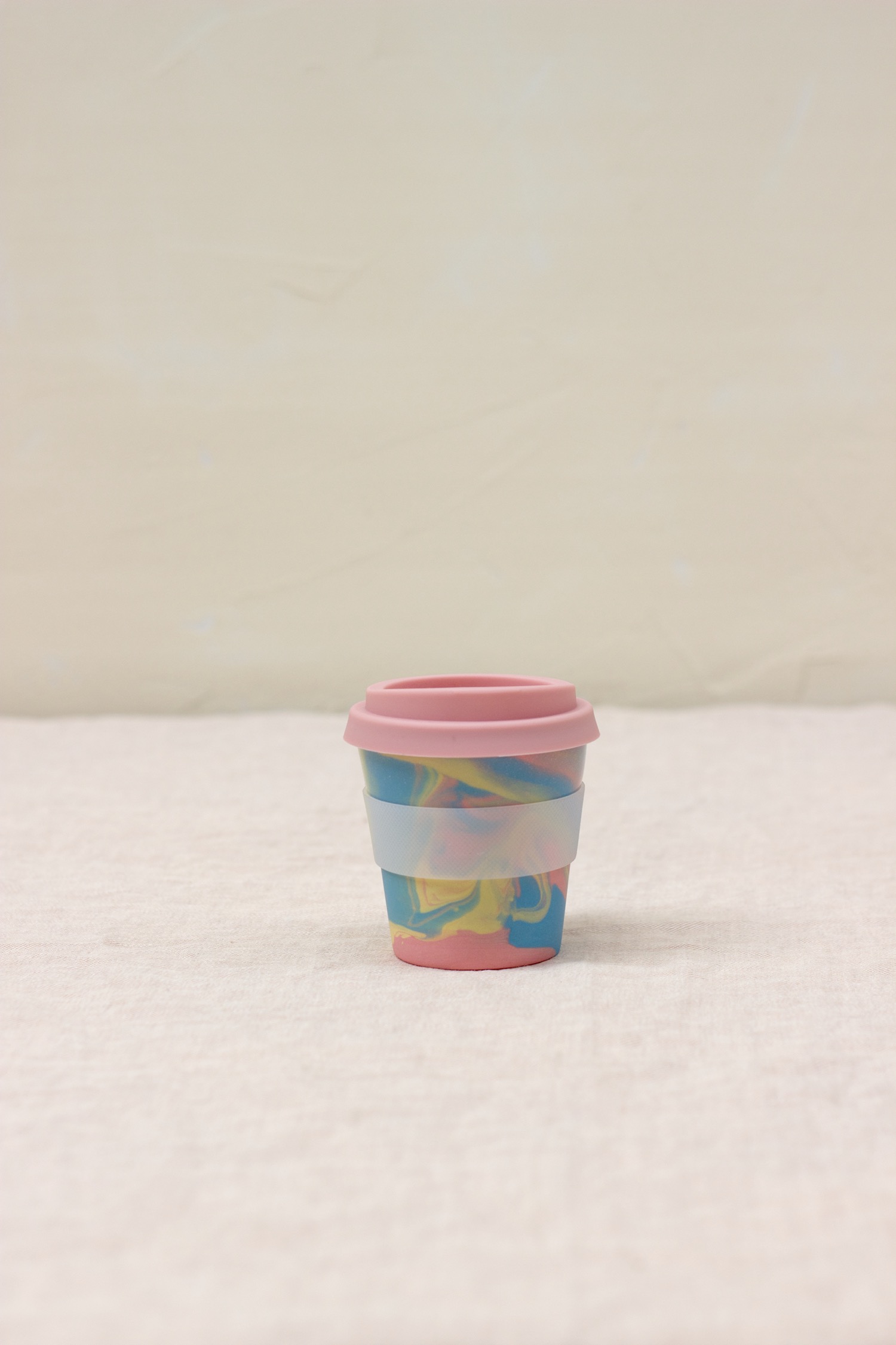 Rainbow paddle pop (a mix of pink, yellow and blue) coloured Blend cup in the ‘6oz’ size with a capacity of approx. 180mL. The 6oz cup is designed to match the size of a small coffee you would order in a cafe, giving your small cap, flat white, latte, long black etc the perfect balance of coffee to milk/water, but is also suitable for tea, water, or any other beverages you like to drink. You can order the cup by itself, or with any combination of silicone lid or sleeve to turn it into a travel cup, ready to be on the go.