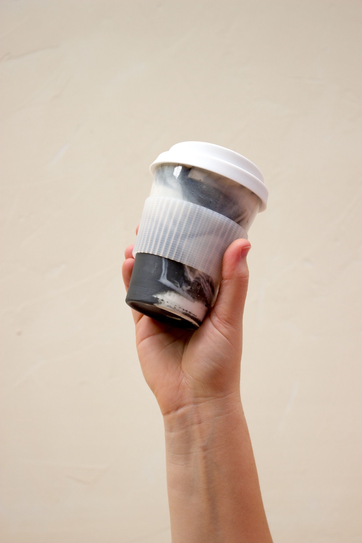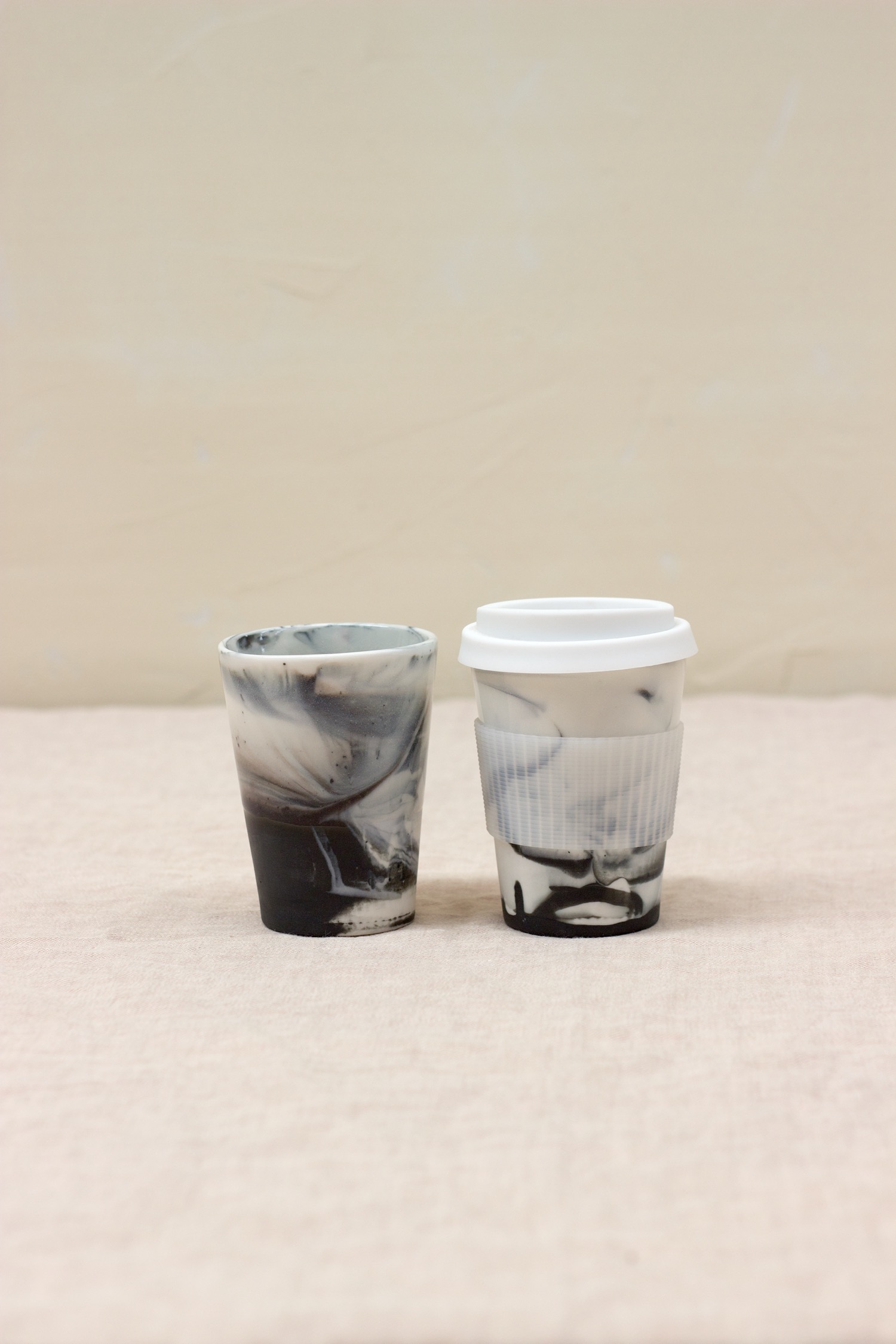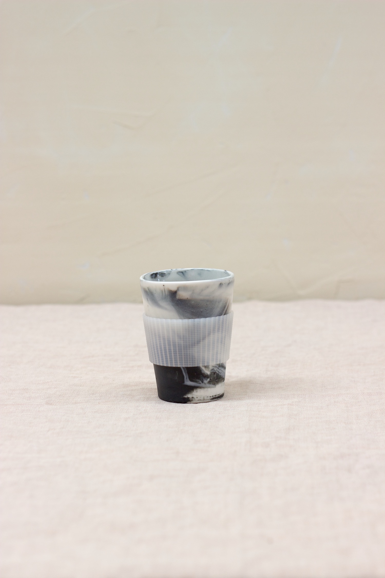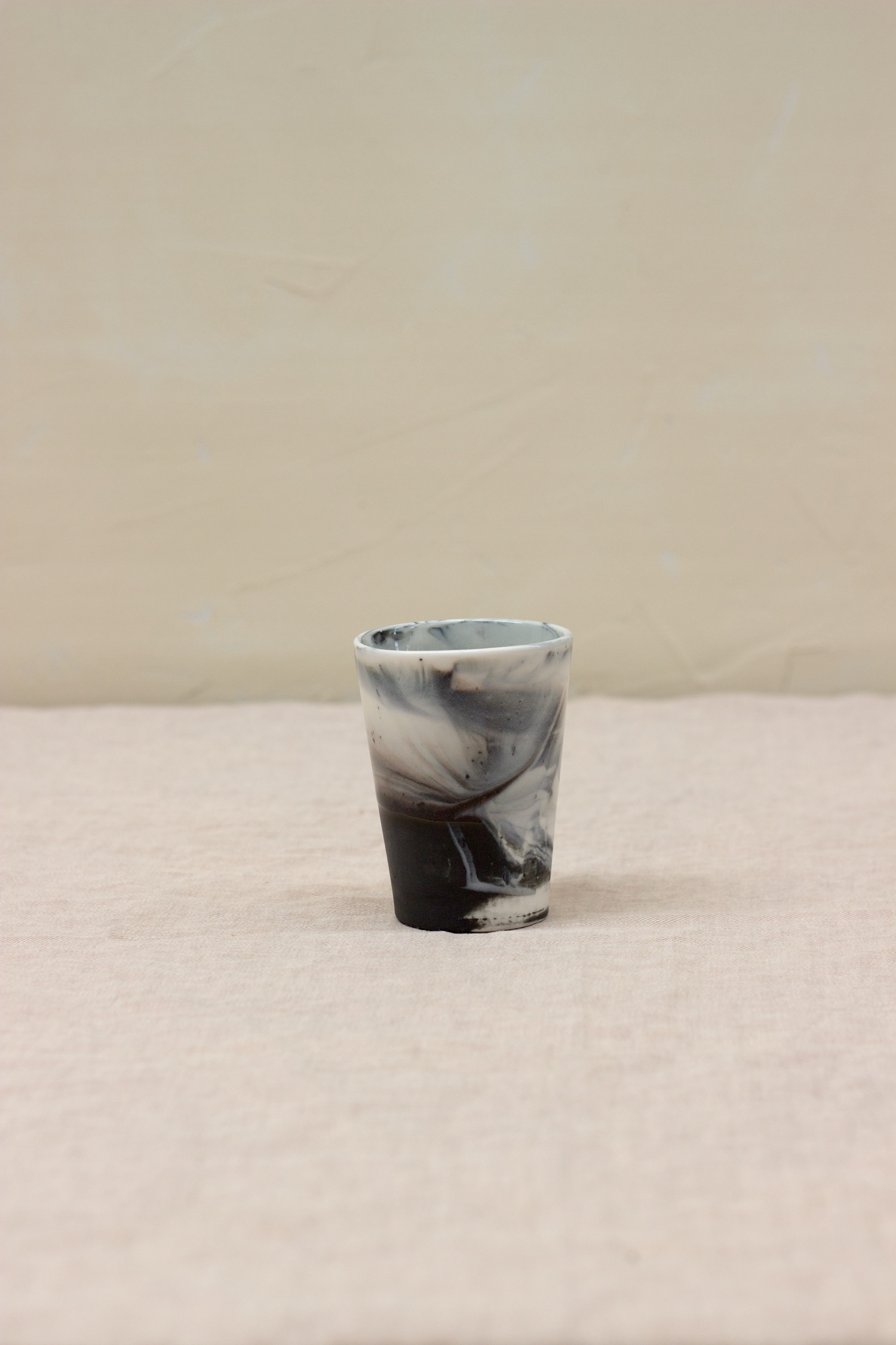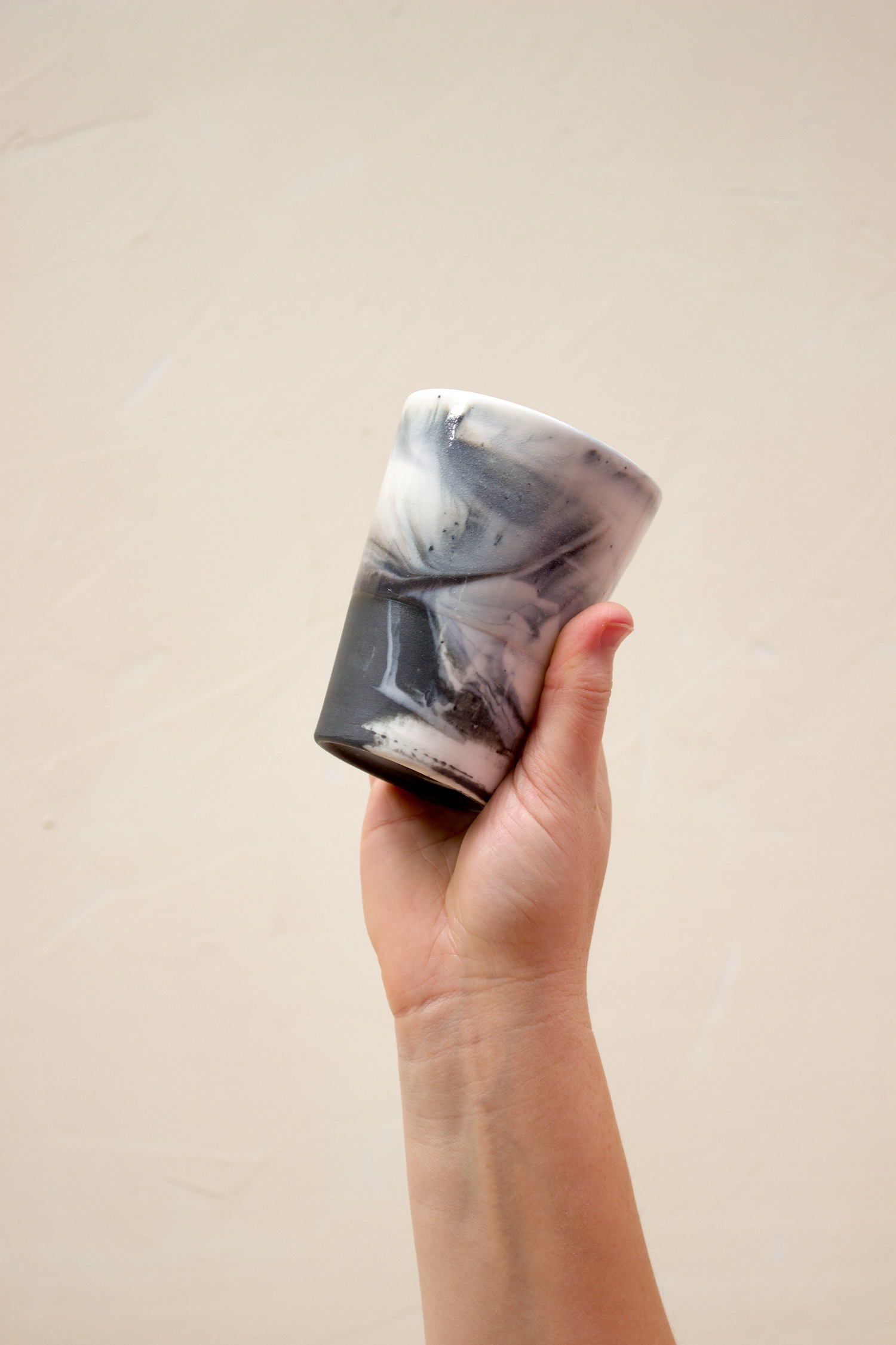 Blend cups are made with coloured slips mixed with white porcelain slip, resulting in their characteristic marbled outside pattern. All pieces are coated with a layer of clear glaze on the inside of the piece, and halfway down the outside, so when you hold the cup you can feel the difference between the glazed and unglazed surface of the porcelain. Each piece is totally unique, and no two patterns are the same!