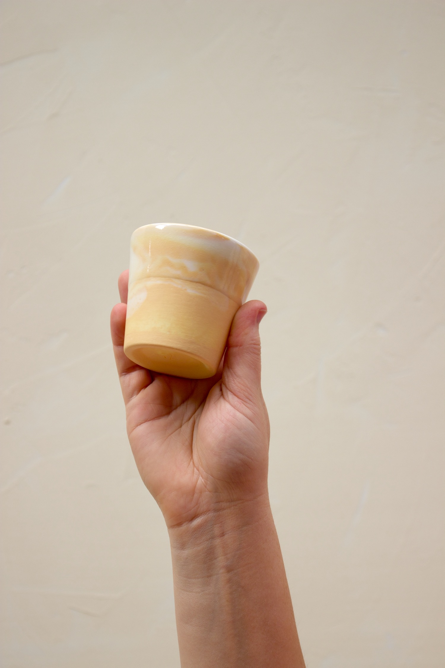 Blend cups are made with coloured slips mixed with white porcelain slip, resulting in their characteristic marbled outside pattern. All pieces are coated with a layer of clear glaze on the inside of the piece, and halfway down the outside, so when you hold the cup you can feel the difference between the glazed and unglazed surface of the porcelain. Each piece is totally unique, and no two patterns are the same!