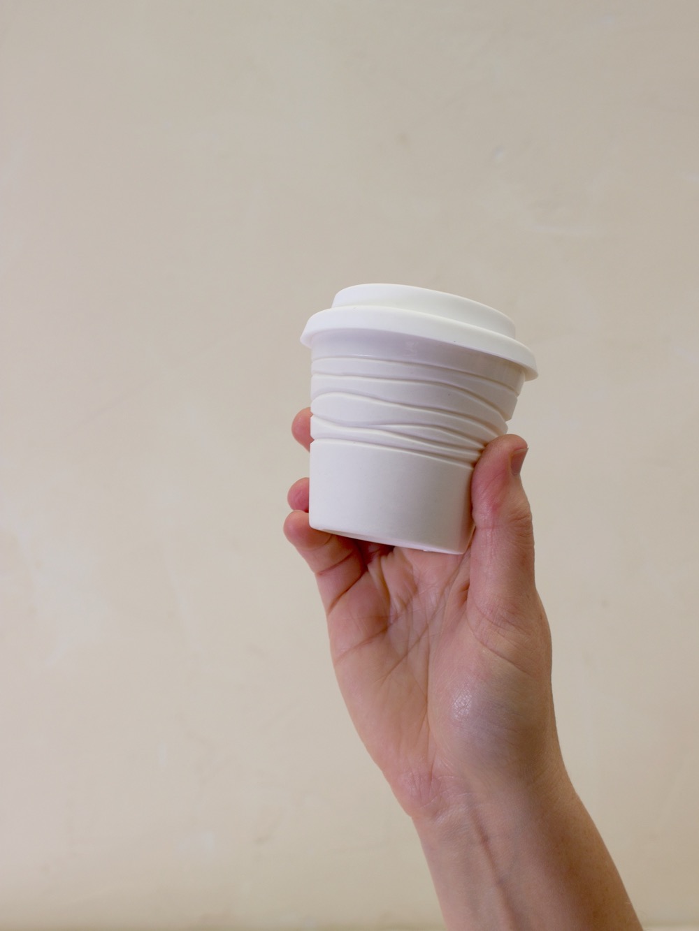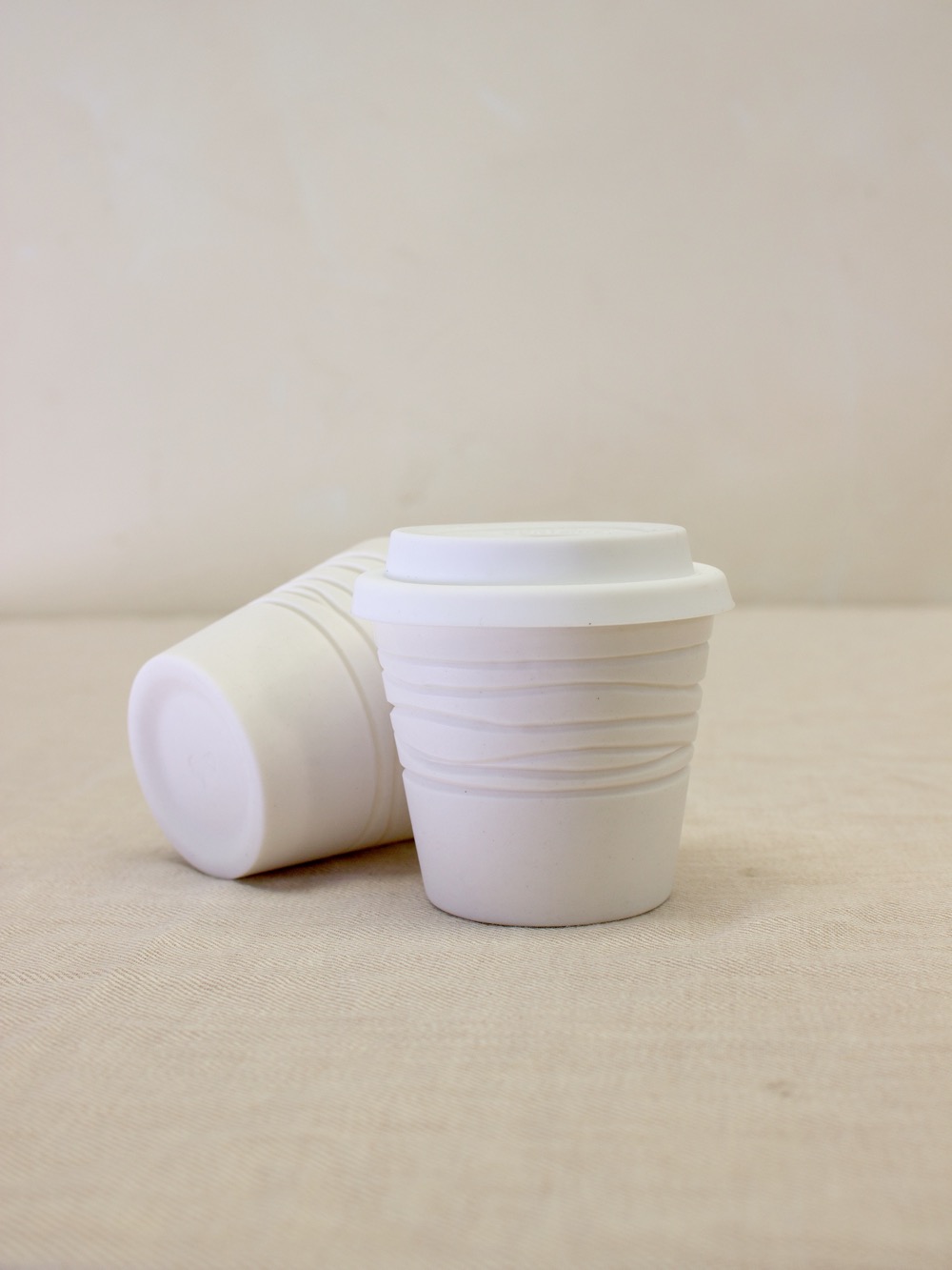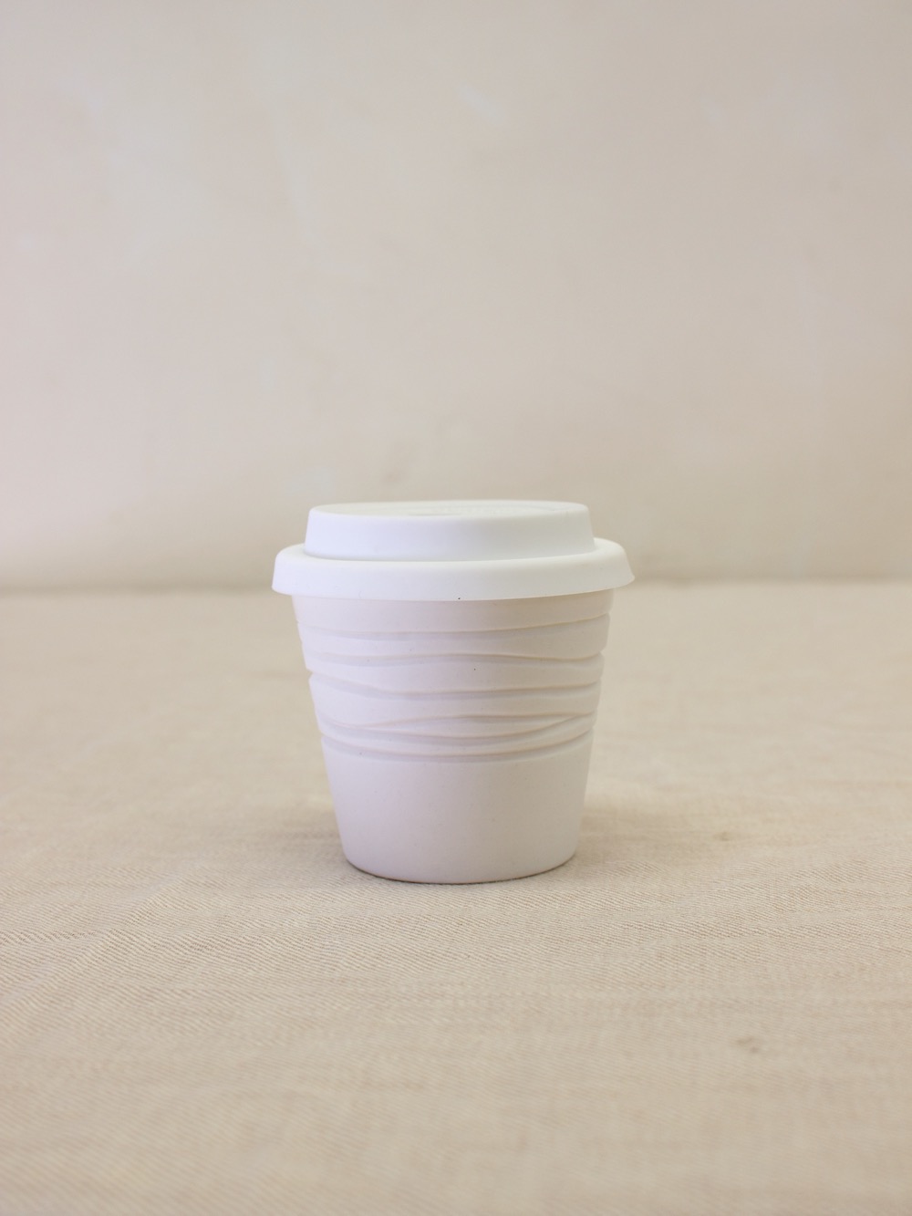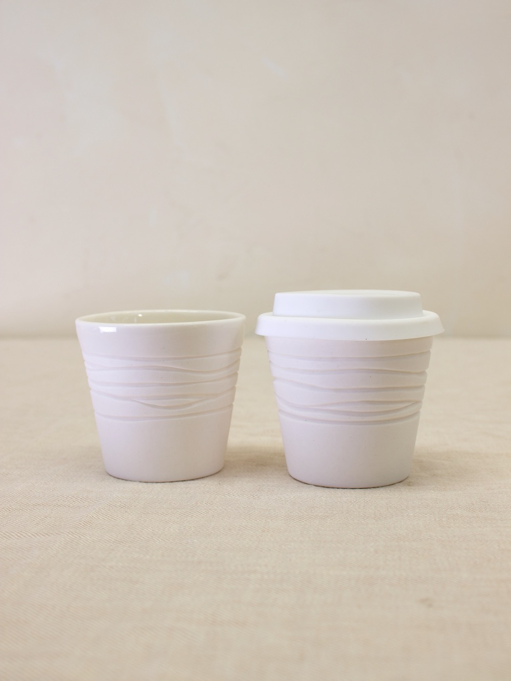 Crossed Wires pattern ‘textured’ cup in the ‘piccolo’ size with a capacity of approx. 120mL. The piccolo cup is designed to match the size of a piccolo coffee you would order in a cafe, giving it the perfect balance of coffee to milk/water, but is also suitable for macchiato, tea, or any other beverages you like to drink. You can order the cup by itself, or with a silicone lid to turn it into a travel cup, ready to be on the go.