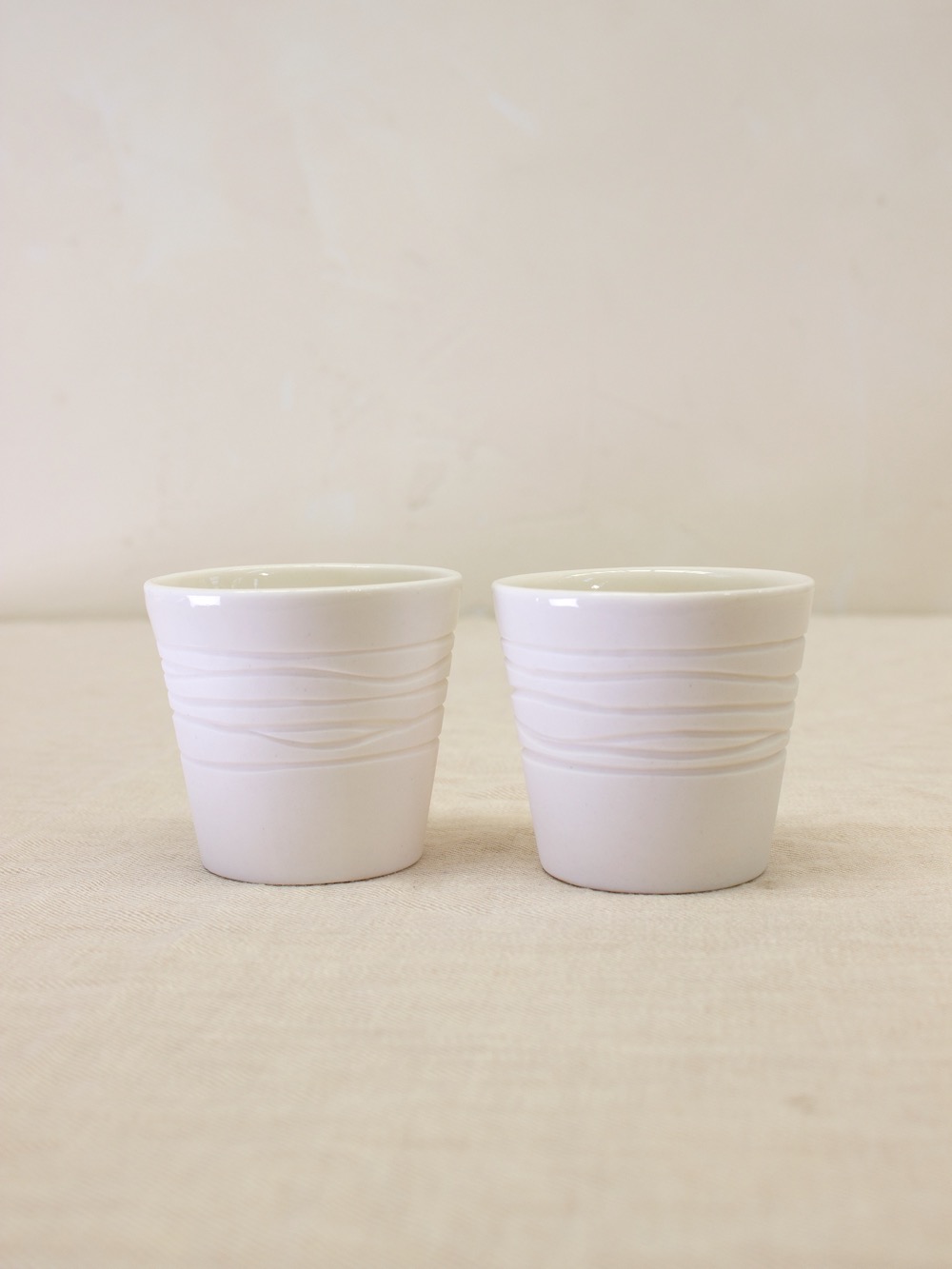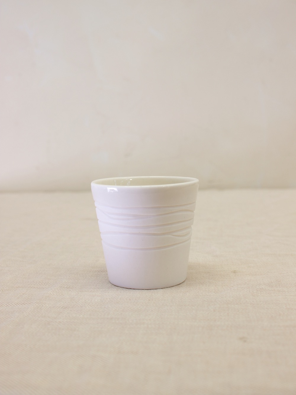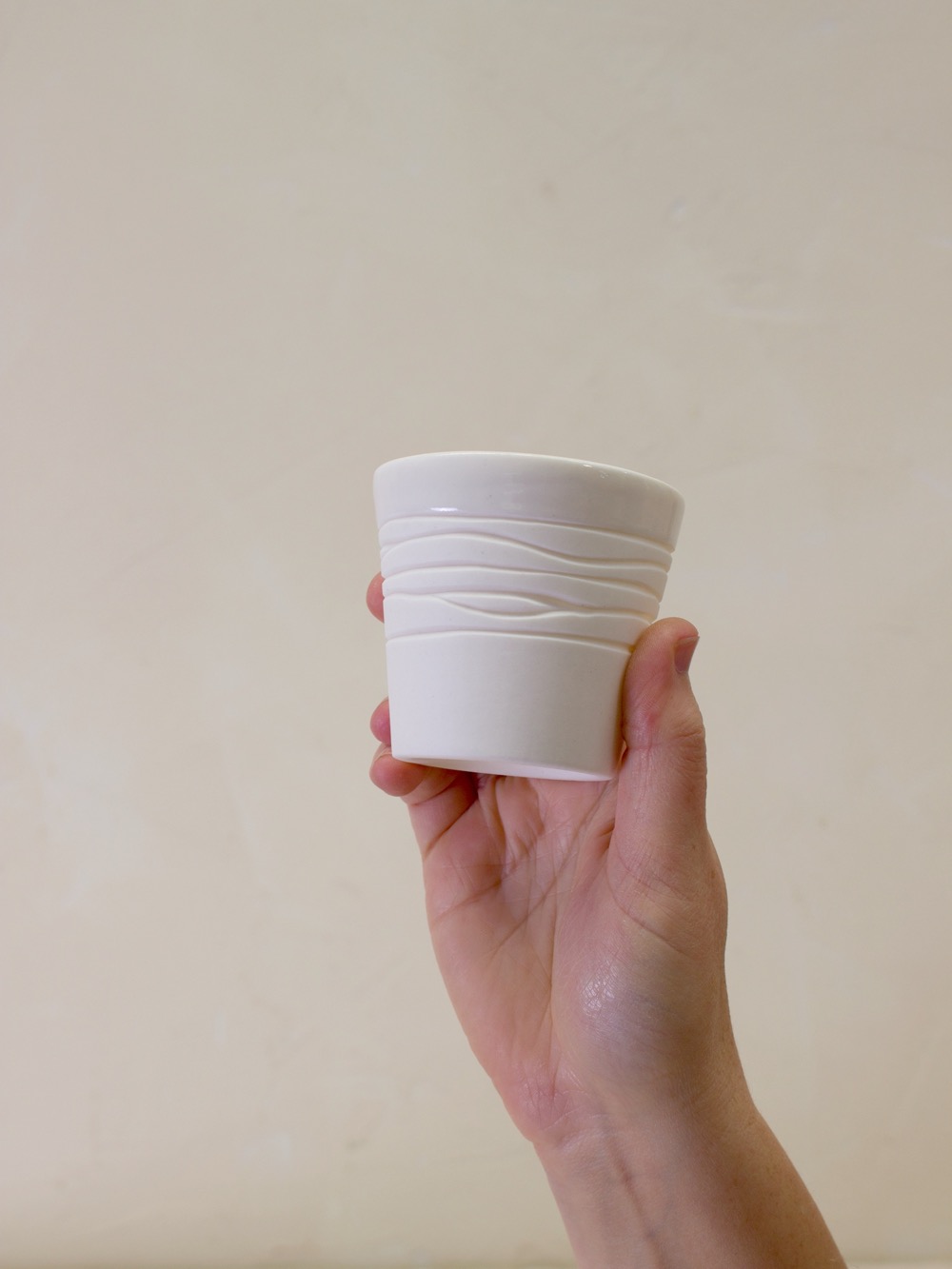 Textured cups are made with touch and tactility in mind. An extension of our range of vases, the textured cup range continues the theme of simplicity, with a simple white porcelain cup whose only adornment in the hand-carved pattern etched into it’s exterior. All pieces are coated with a layer of clear glaze on the inside of the piece which comes up over the lip and down to the top of the pattern, so it feels smooth to your lip, but you have the lovely feeling of the textured porcelain in your hand. Each piece is hand-carved, so there will be minor differences from piece to piece.